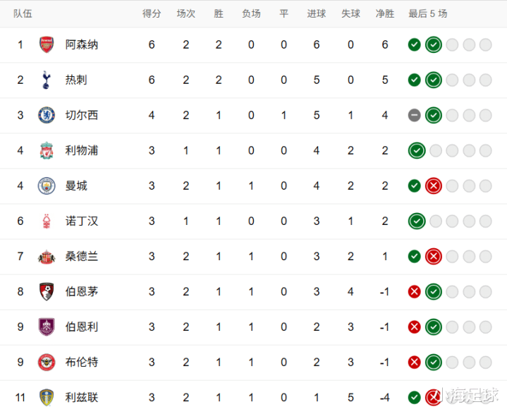 目前积分榜上,热刺与阿森纳同积六分领跑,伯恩利升至第三位。曼城与阿斯顿维拉均未取得胜利,暂居积分榜中下游位置。狼队与西汉姆联遭遇两连败,排名联赛末尾。