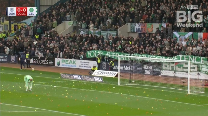 直播吧10月20日讯《太阳报》报道,凯尔特人球迷对其俱乐部董事会的抗议行动在本周客场对阵邓迪FC的比赛中再次升级,并导致比赛在开球后不久便中断了三分钟。愤怒的凯尔特人球迷向场内投掷了大量网球、小型弹力球甚至橘子,一度铺满了本方进攻方向的禁区。