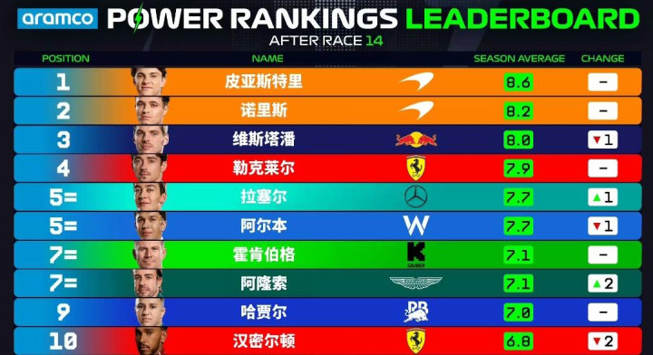 总榜中,维斯塔潘被诺里斯反超跌落到第三。他在亨格罗宁赛道仅列第九。