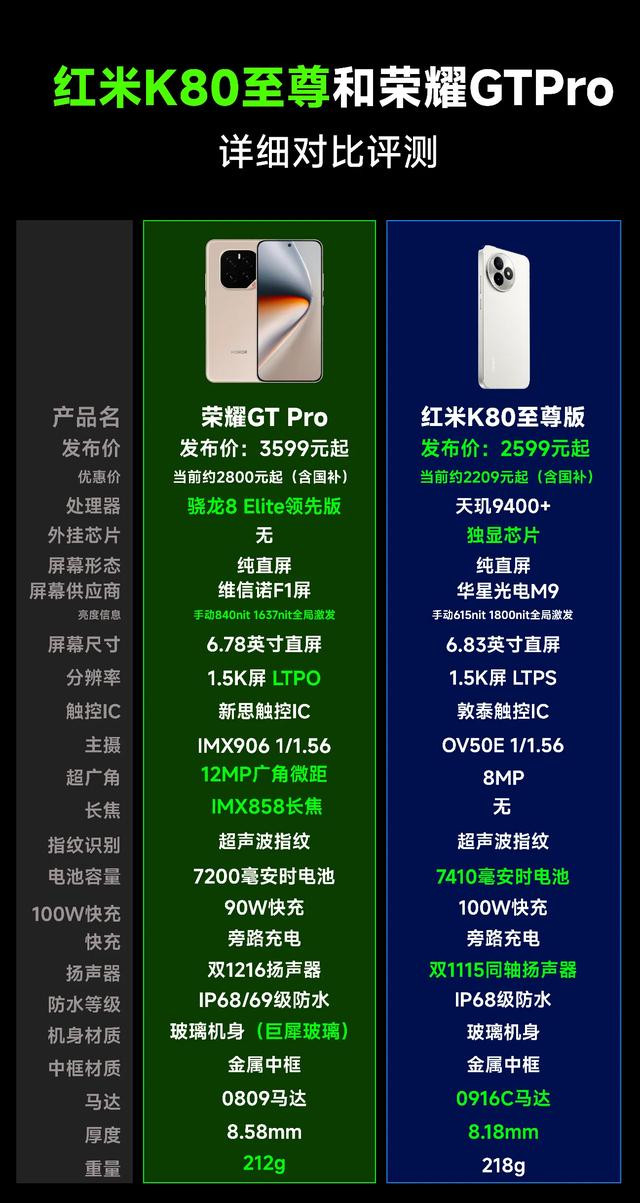 荣耀GT Pro在综合配置上肯定是要比红米K80至尊版更高的,这个没有任何疑问。