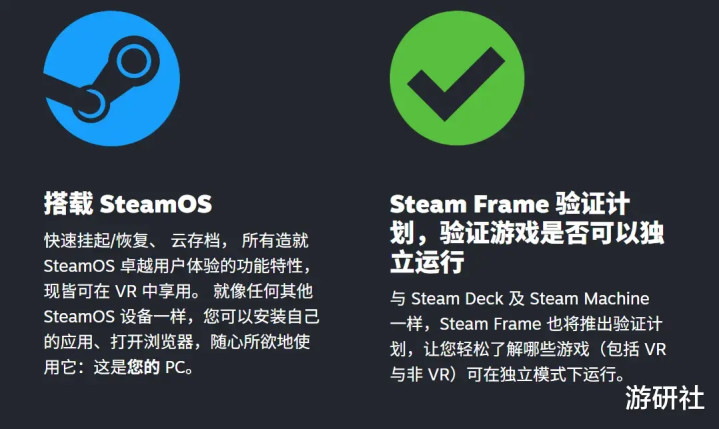官网特别强调:Steam Frame 是台 PC,搭载由骁龙® 8 系处理器驱动的 SteamOS。配备 16GB 内存,支持以独立运行方式畅玩 VR 与非 VR 游戏,而无需从 PC 上流式传输,且兼容游戏的数量将不断上升。
